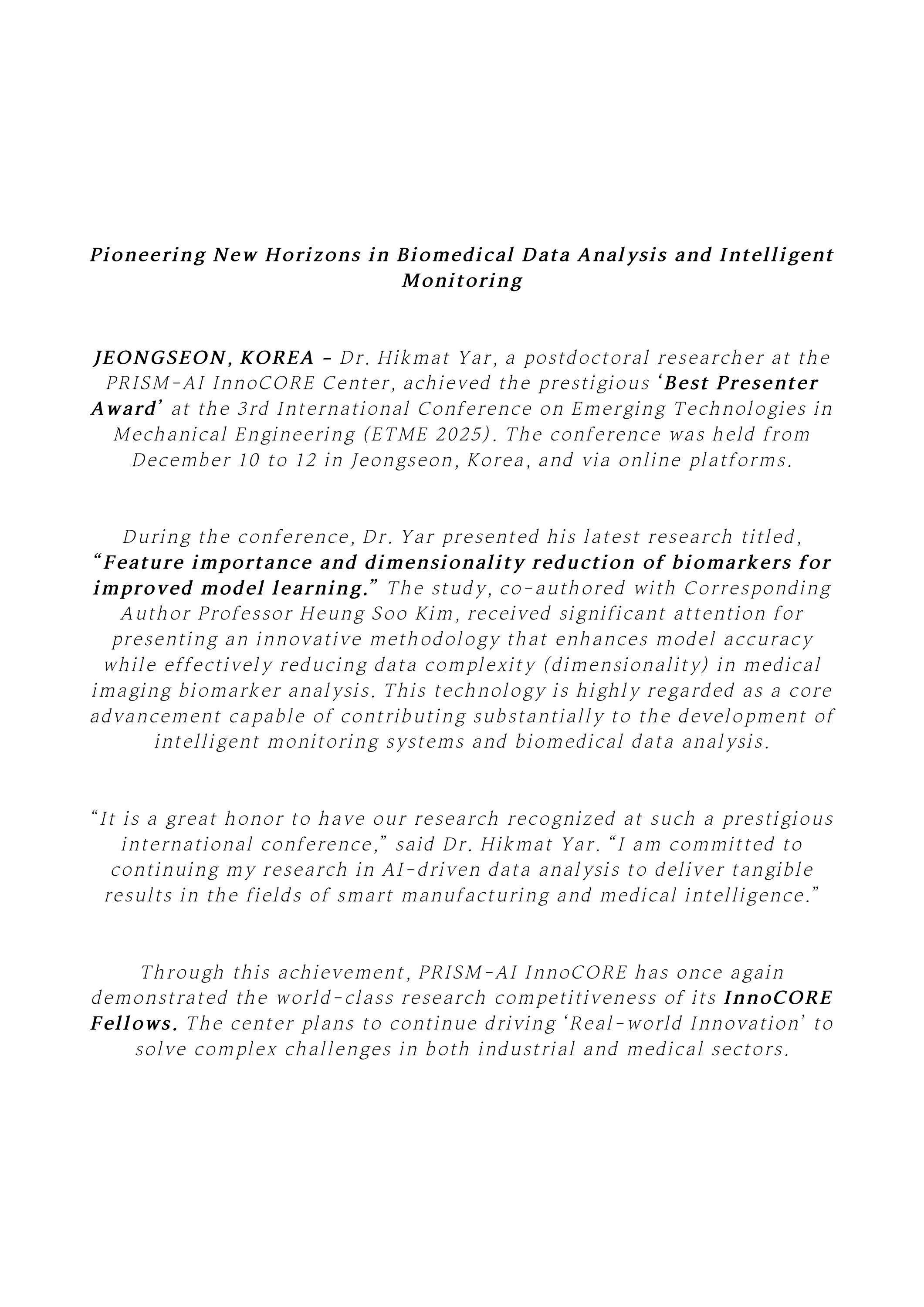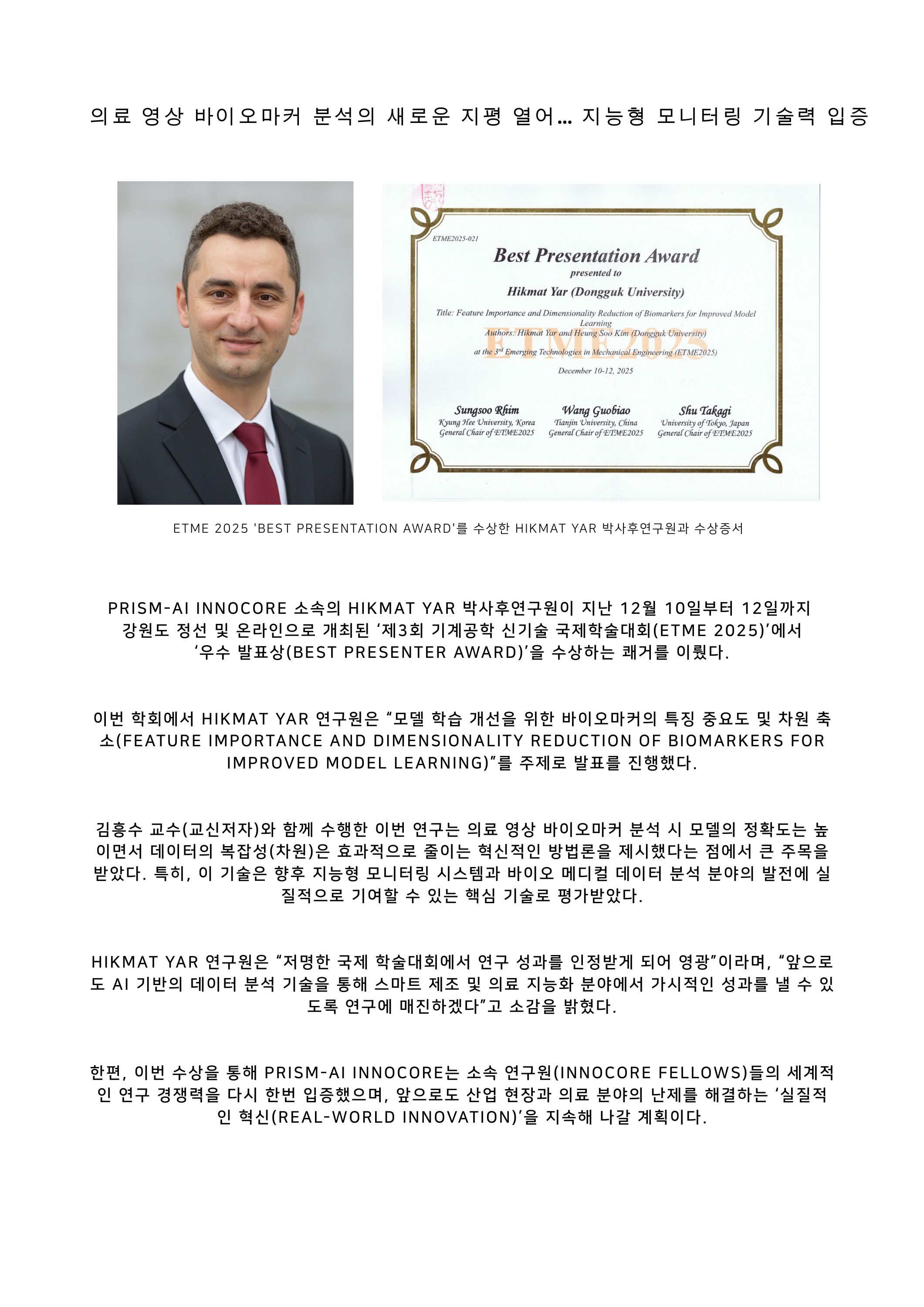 [NEWS] PRISM-AI InnoCORE Hikmat Yar 연구원, ETME 2025 ‘우수 발표상’ 수상